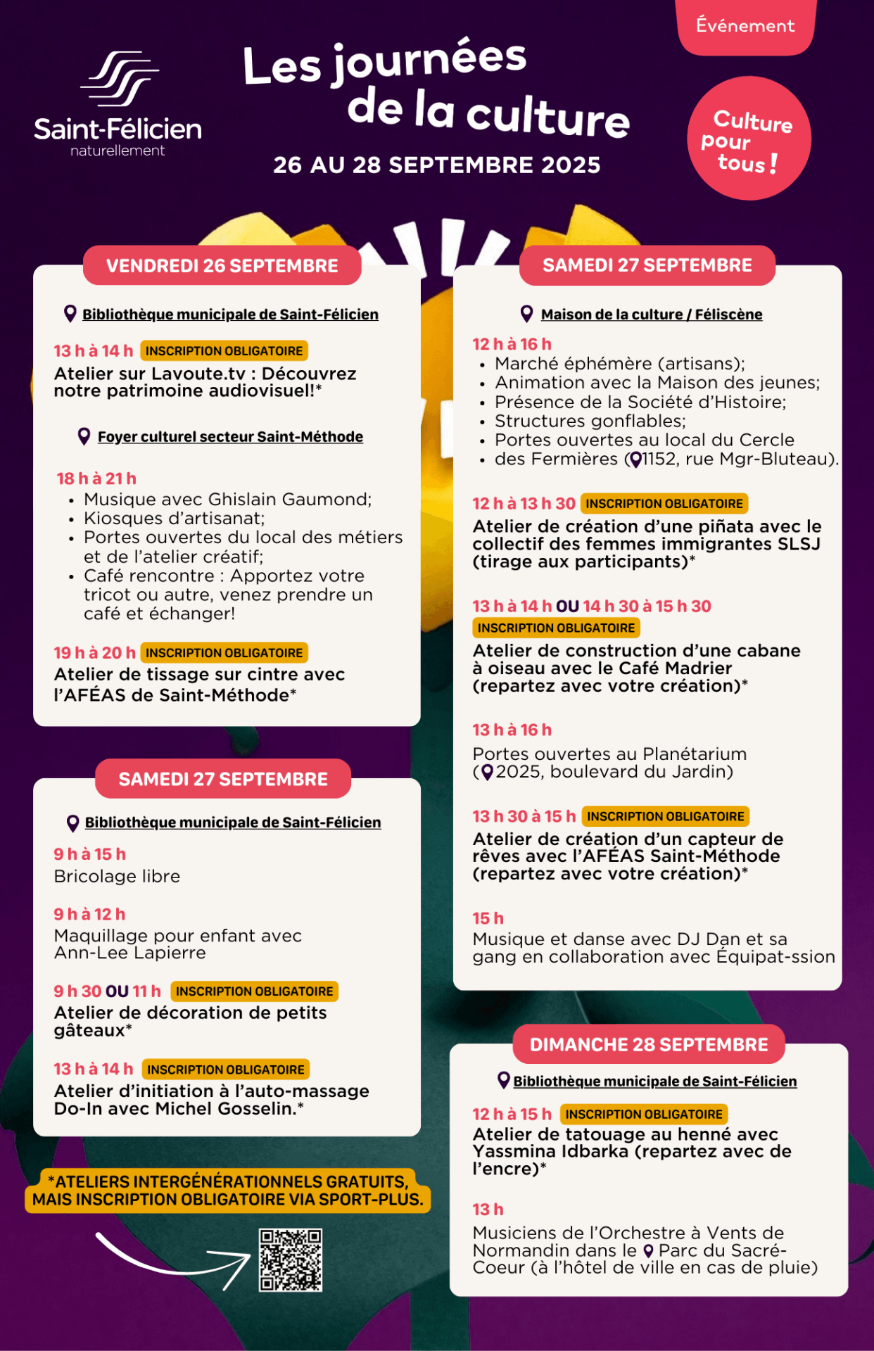 • *13 h 30 à 15 h : Atelier de création d’un capteur de rêves avec l’AFÉAS de Saint-Méthode (inscription requise sur Sport-Plus)